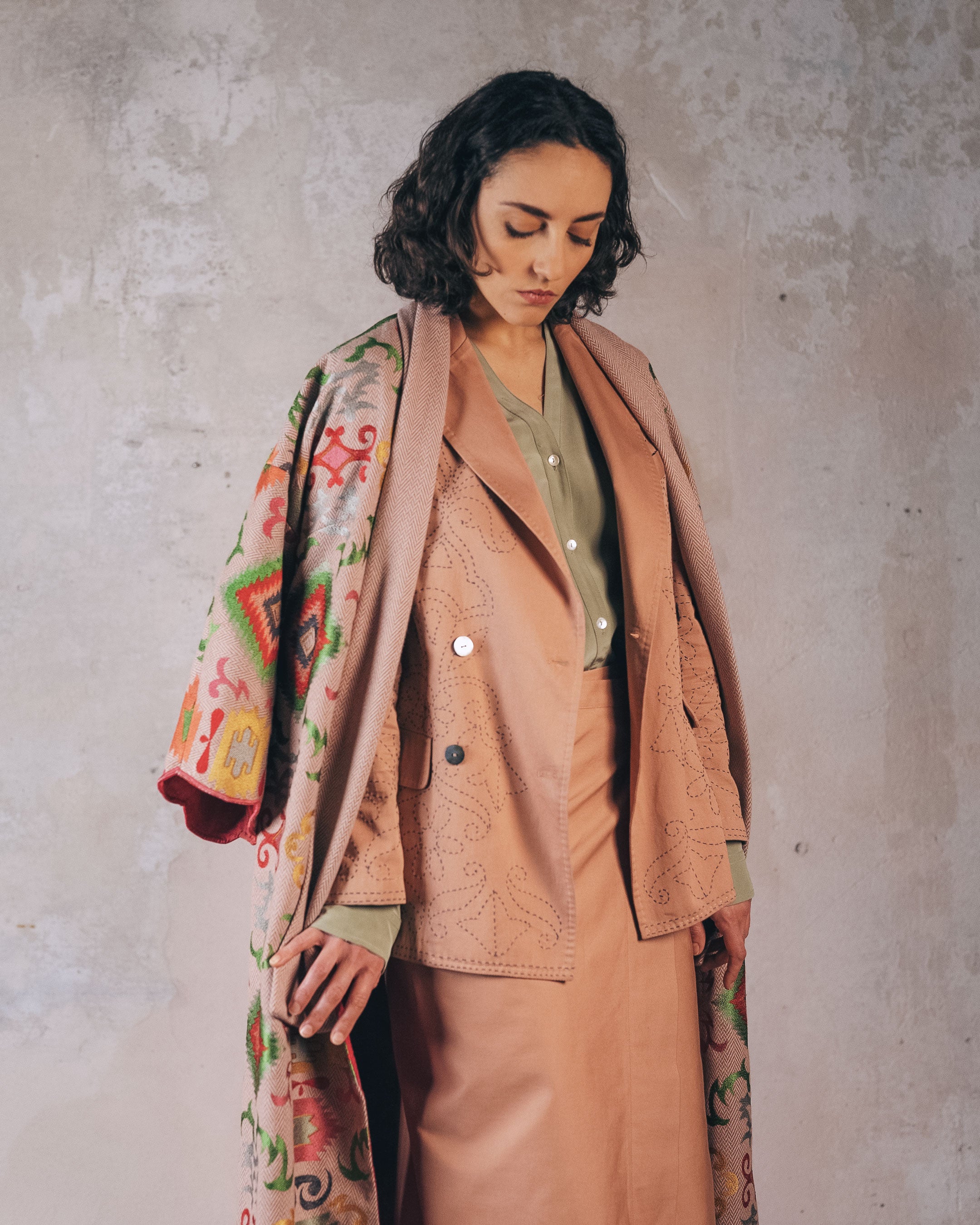 Tagliato in sbieco, con 4 metri di punti a mano, due asole nascoste e una scollatura iper femminile.