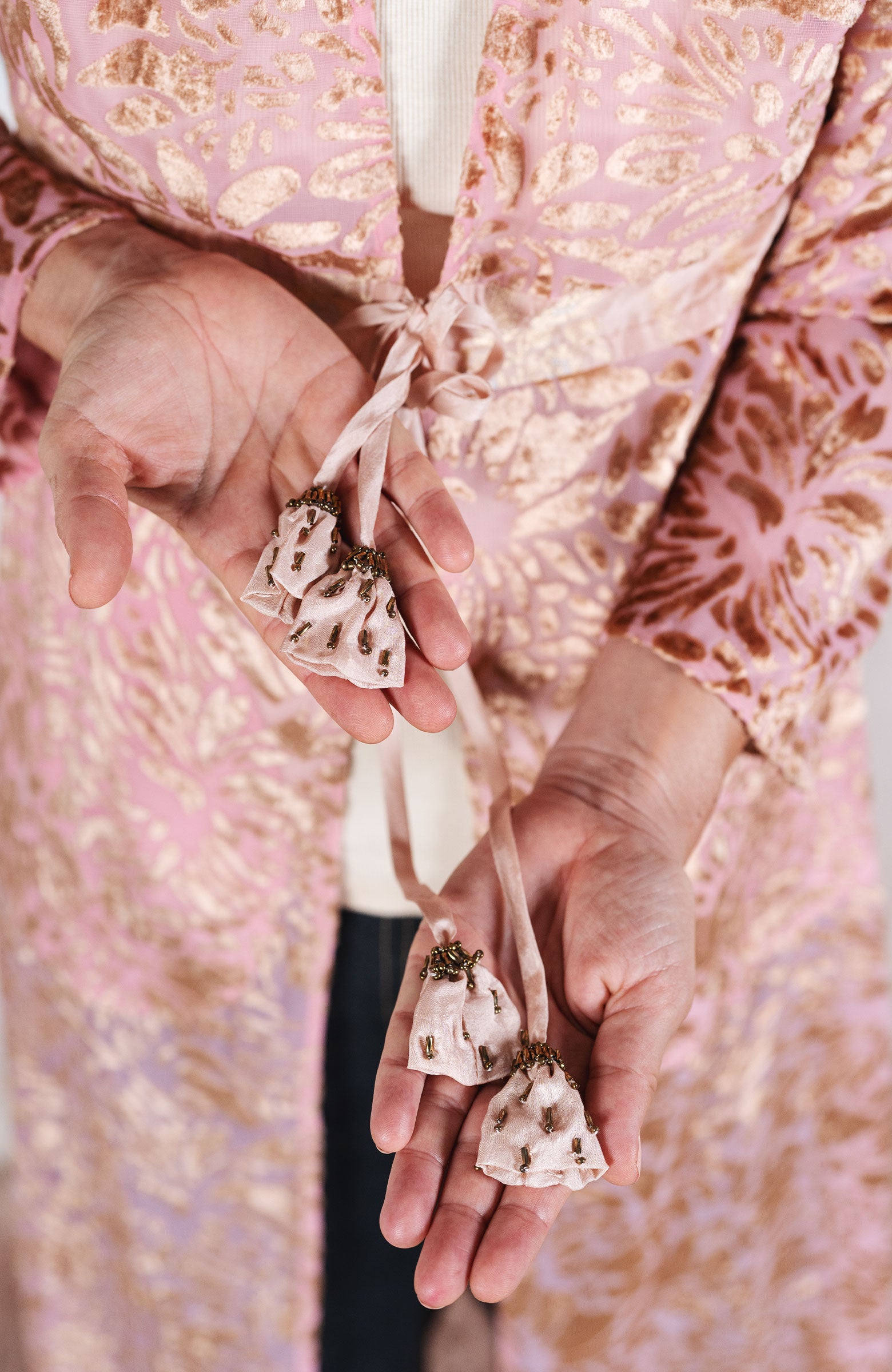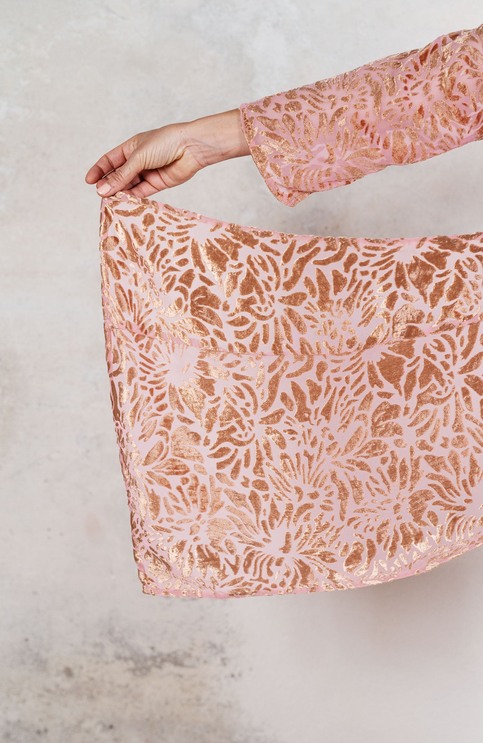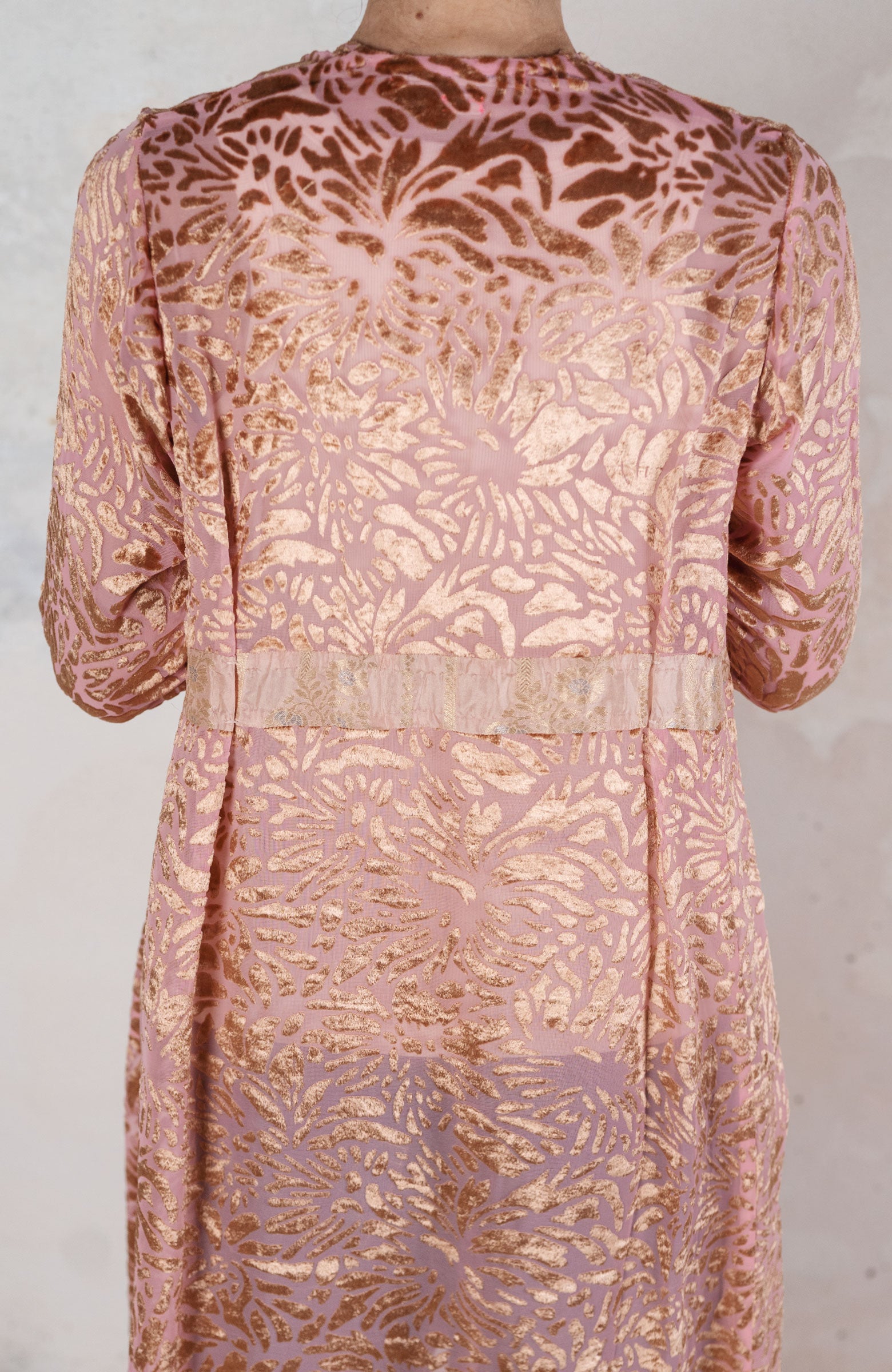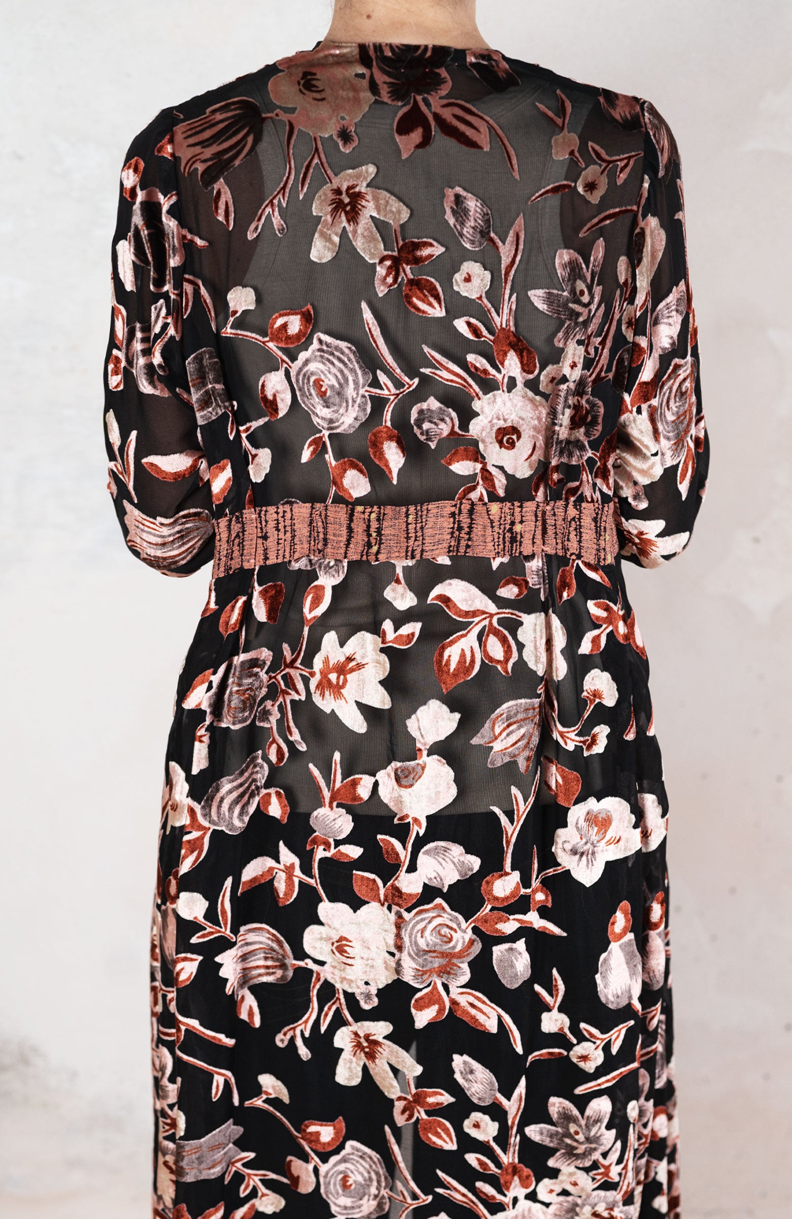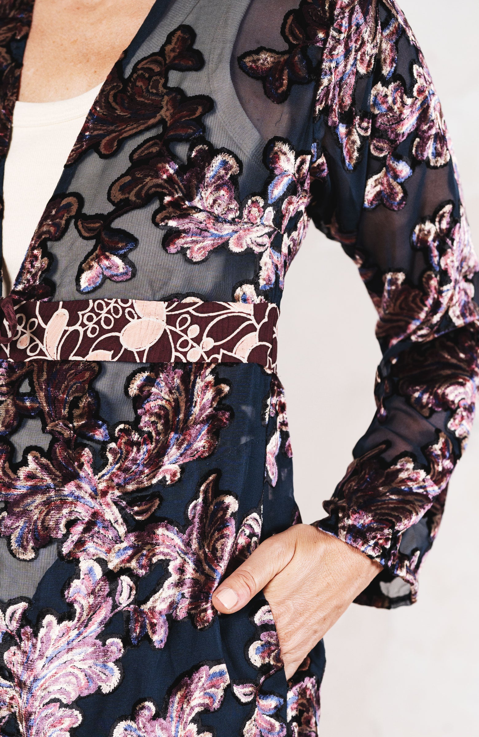 Lightweight, devoré velvet coat. Long, flared, with side slits and deep pockets, finished with meter