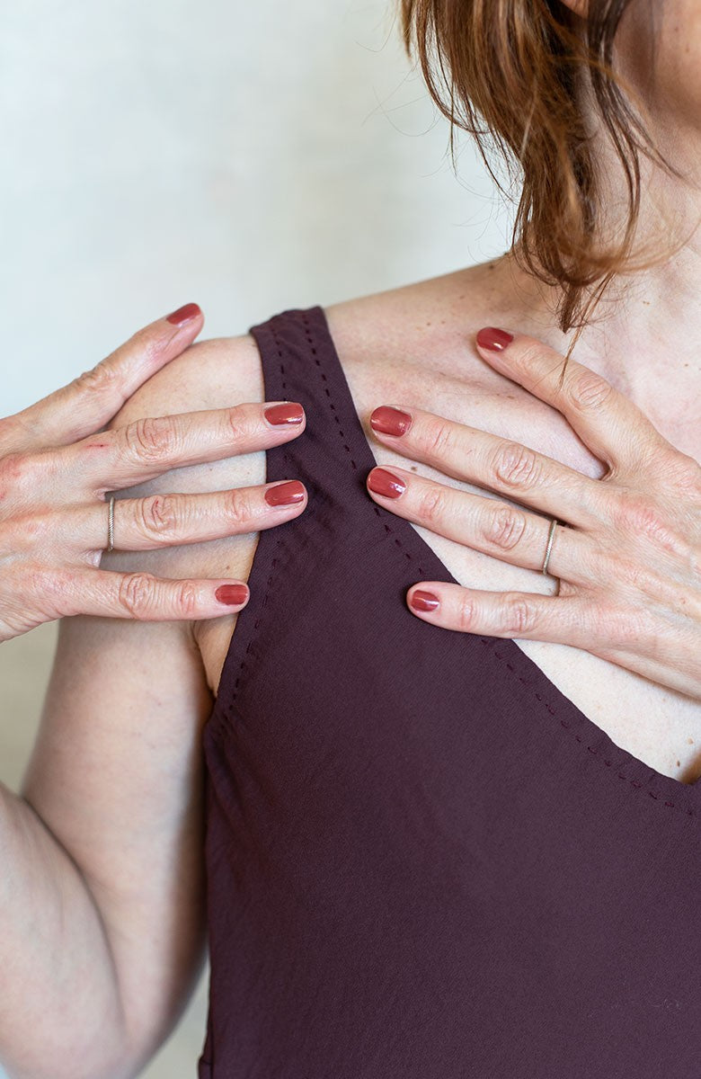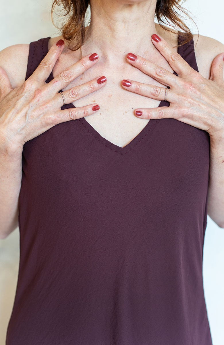 Sleeveless dress with a deep neckline. Bias-cut fabric, hand-stitched edges and hem. This is the lon
