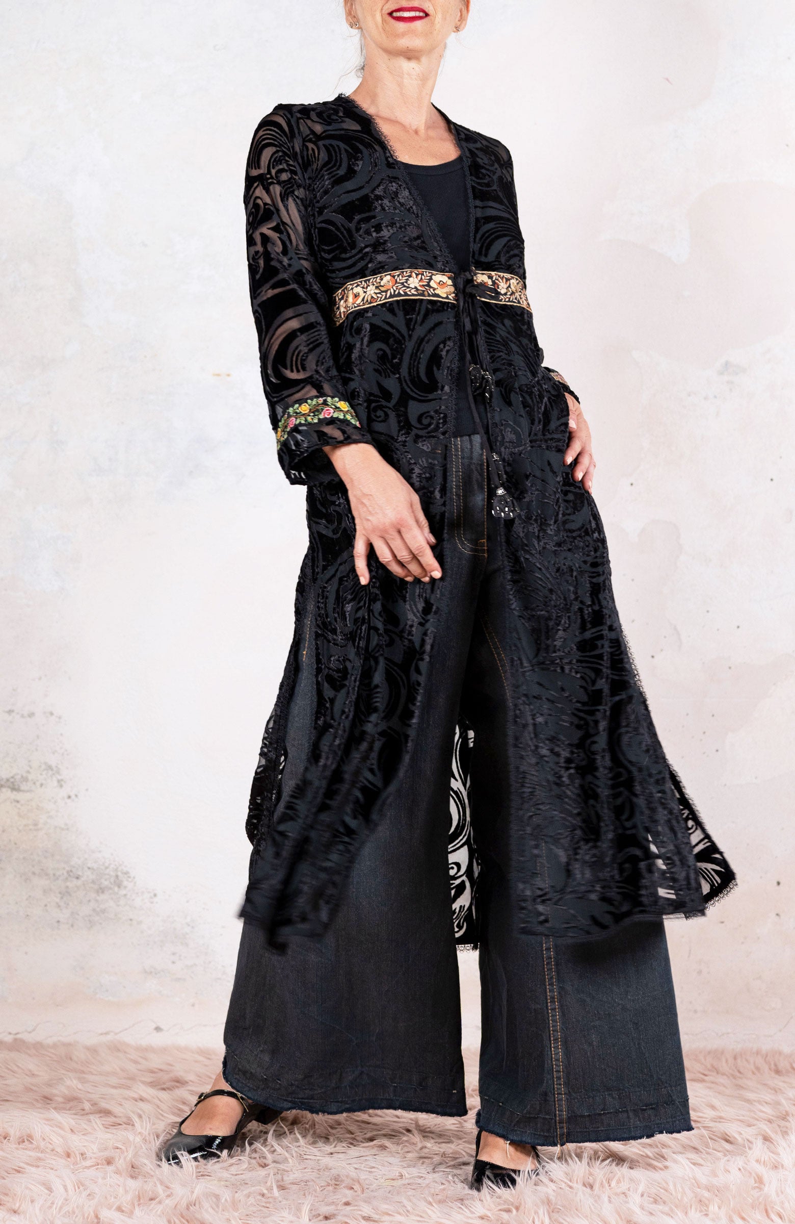 Lightweight, devoré velvet coat. Long, flared, with side slits and deep pockets, finished with hand-stitched lace trim all around. Ancient Indian embroidery is applied to the waistband and cuffs. Four tassels, entirely hand-crafted and embroidered, are sewn onto the waistband. When a sartorial necessity—closing a coat—becomes pure magic. It's the perfect addition to any suitcase and outfit: from the most eccentric to the most chic, from the most rock-n-roll to the most casual.