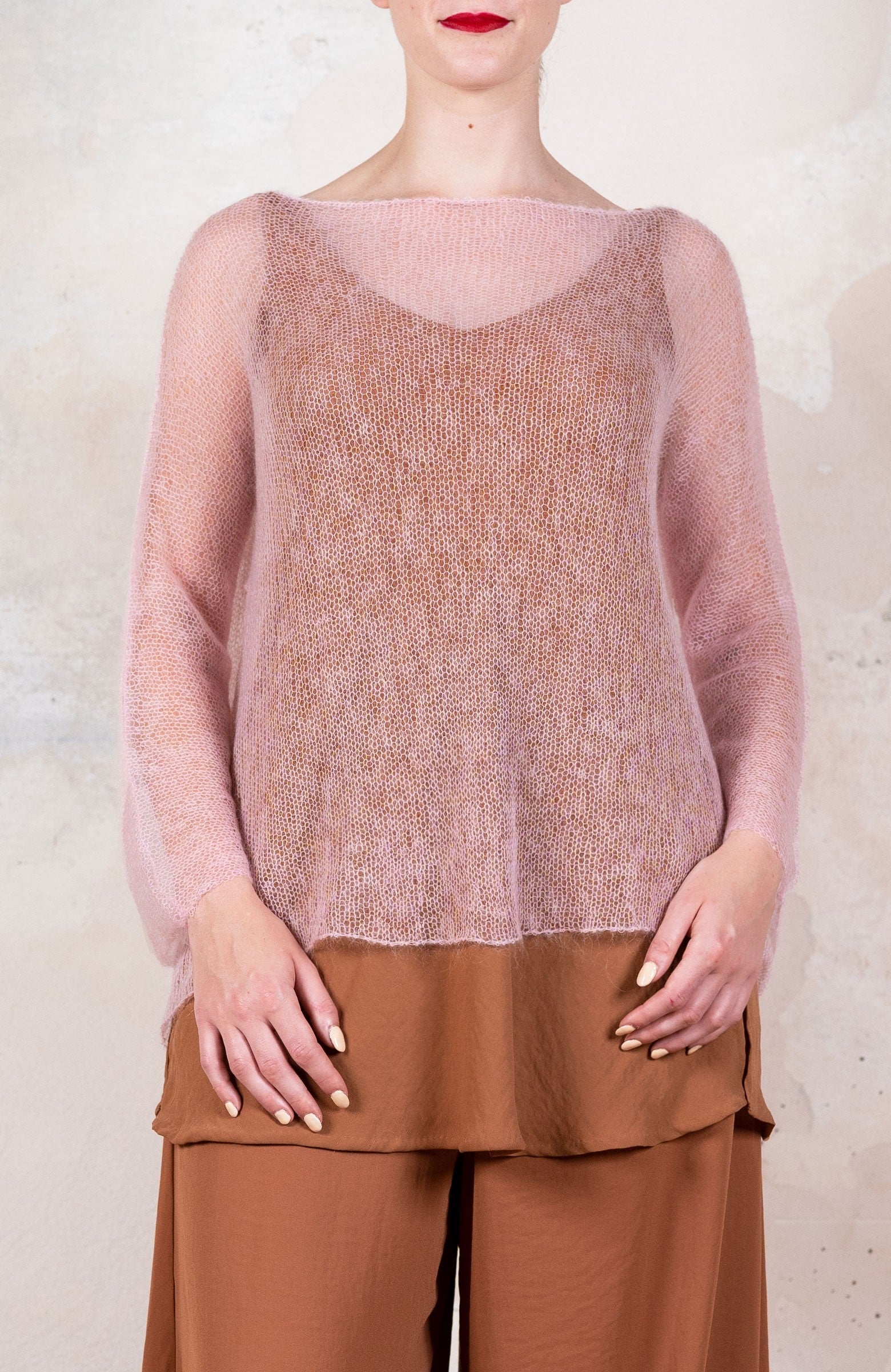 Maglia con manica a kimono e scollo a barchetta, cuciture a rimaglio sul fianco -il rimaglio sta all