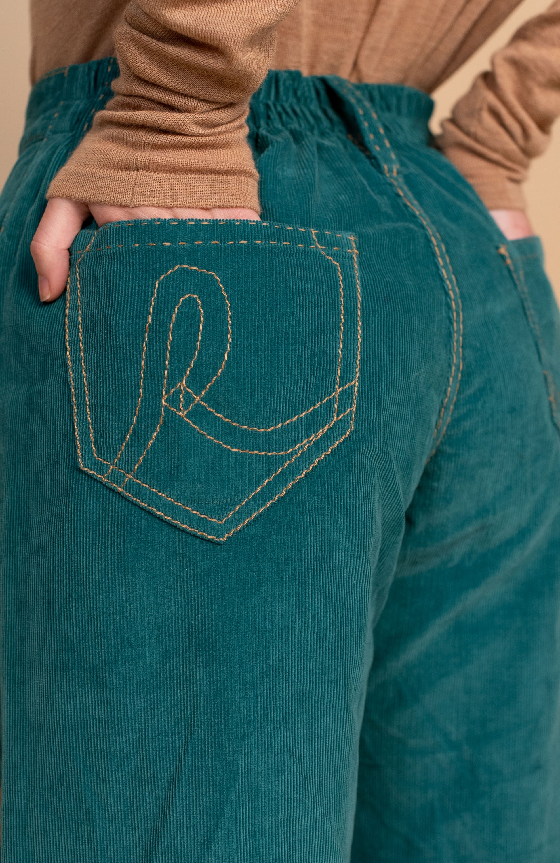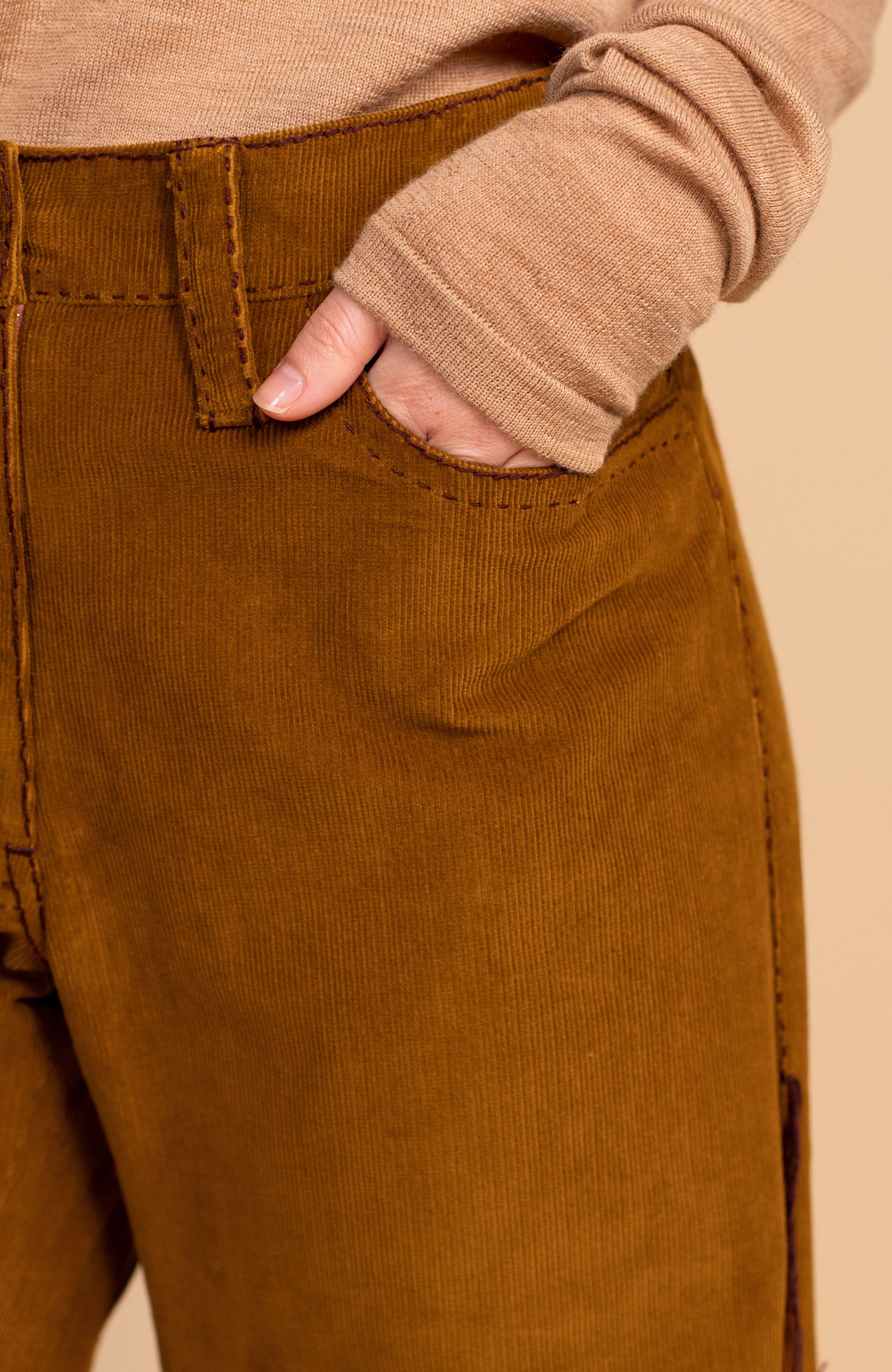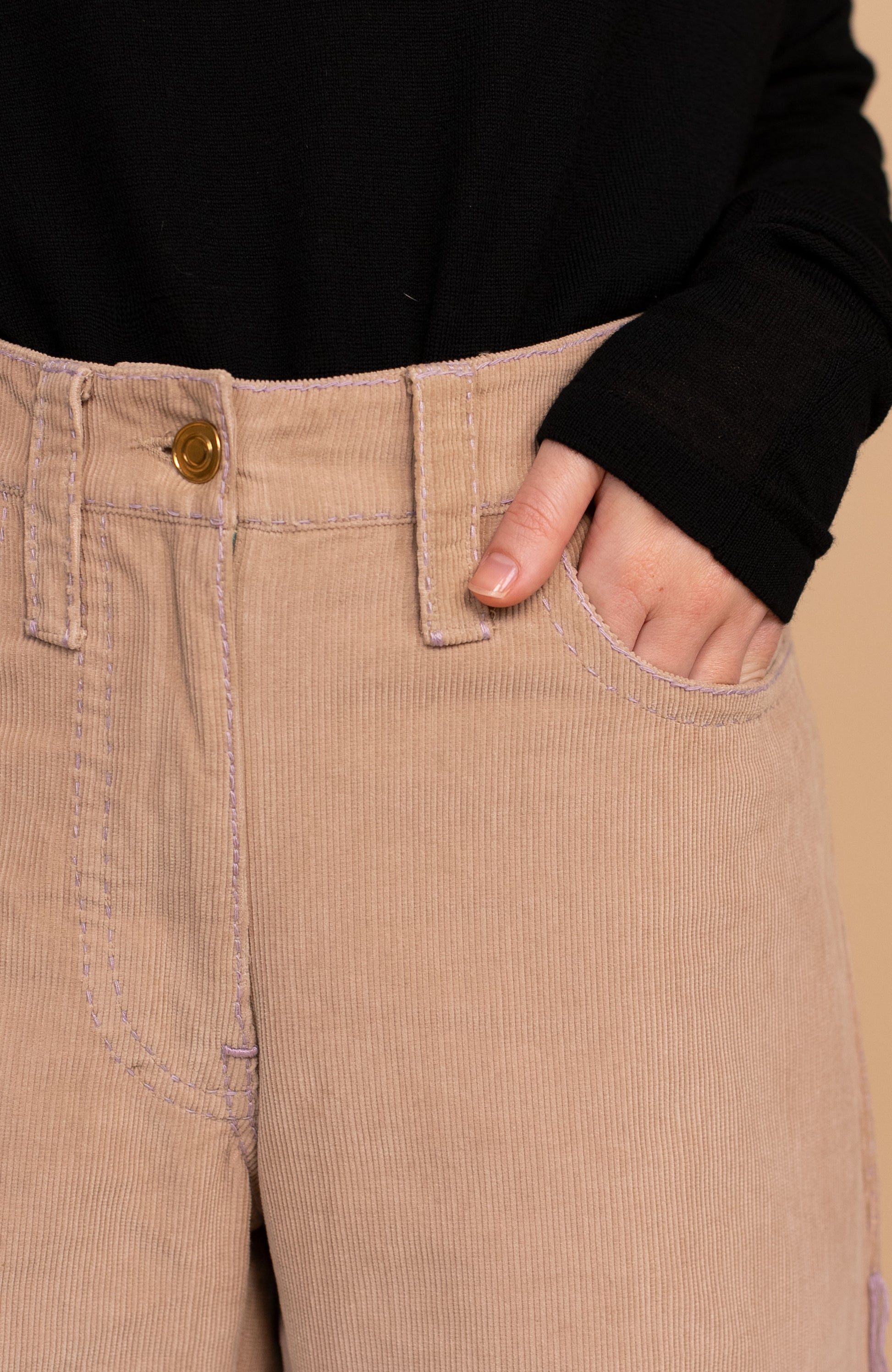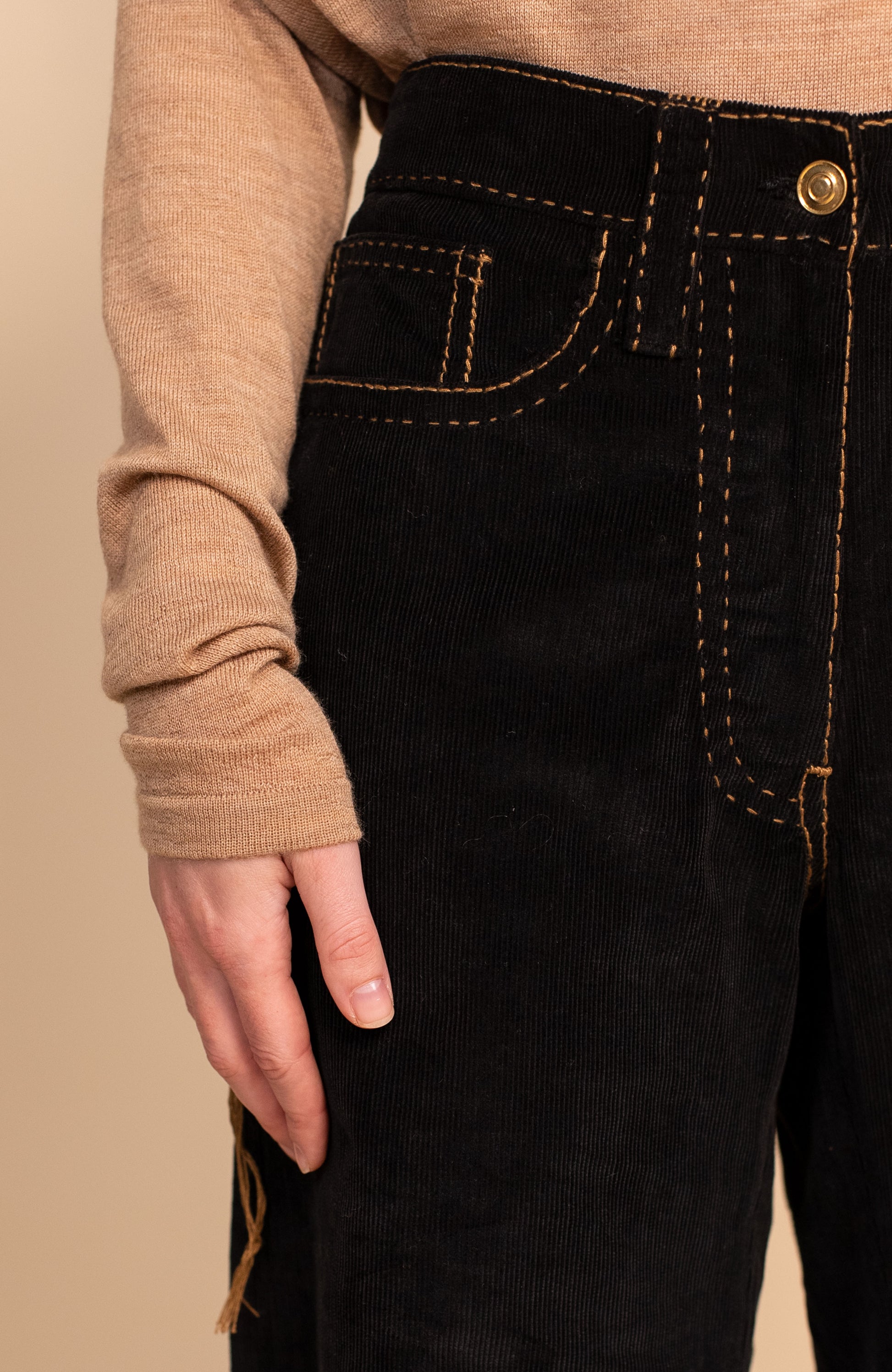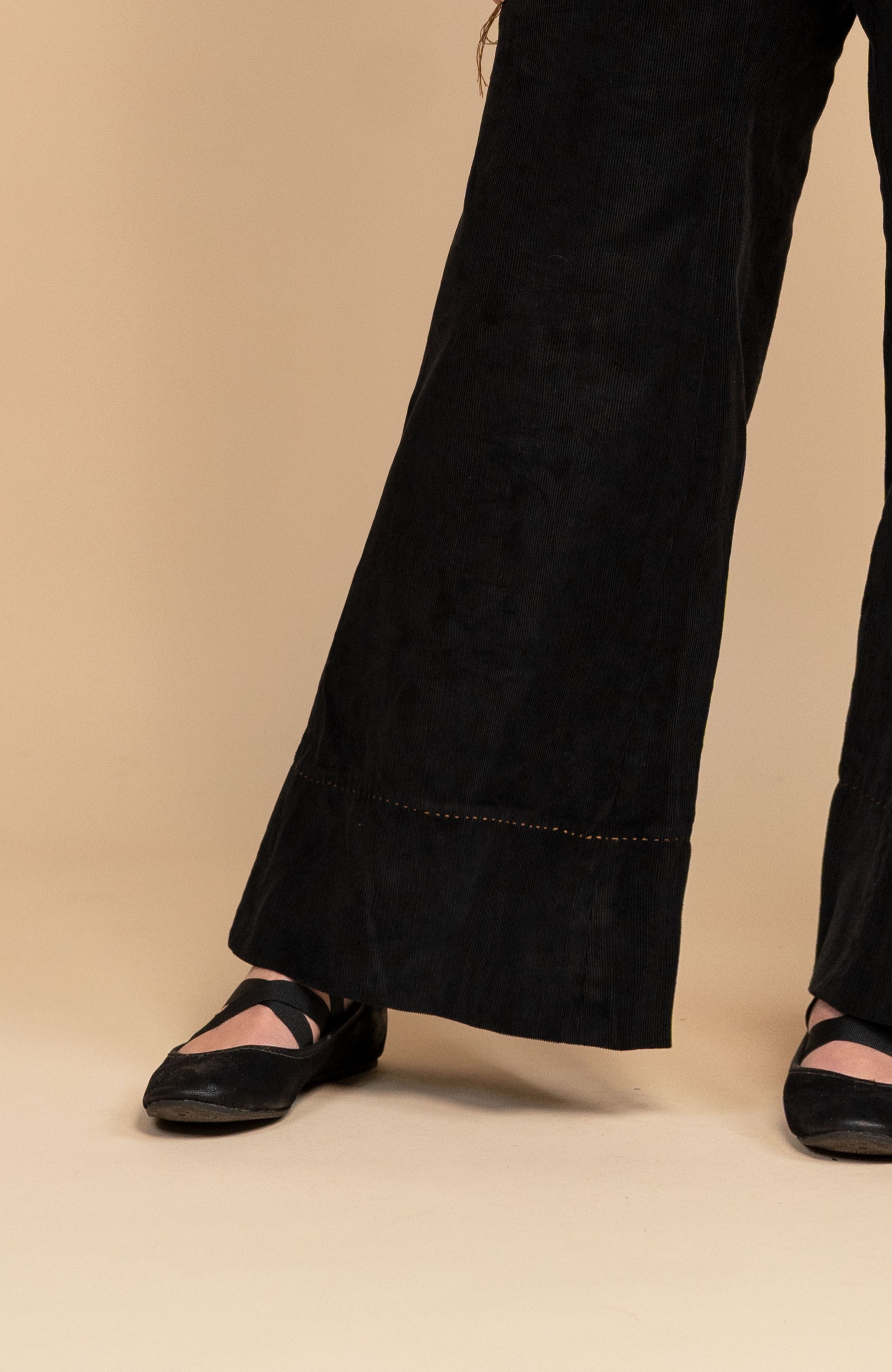 Striped velvet flared trousers, crisp and structured. Elastic waist, deep pockets, metal zipper and