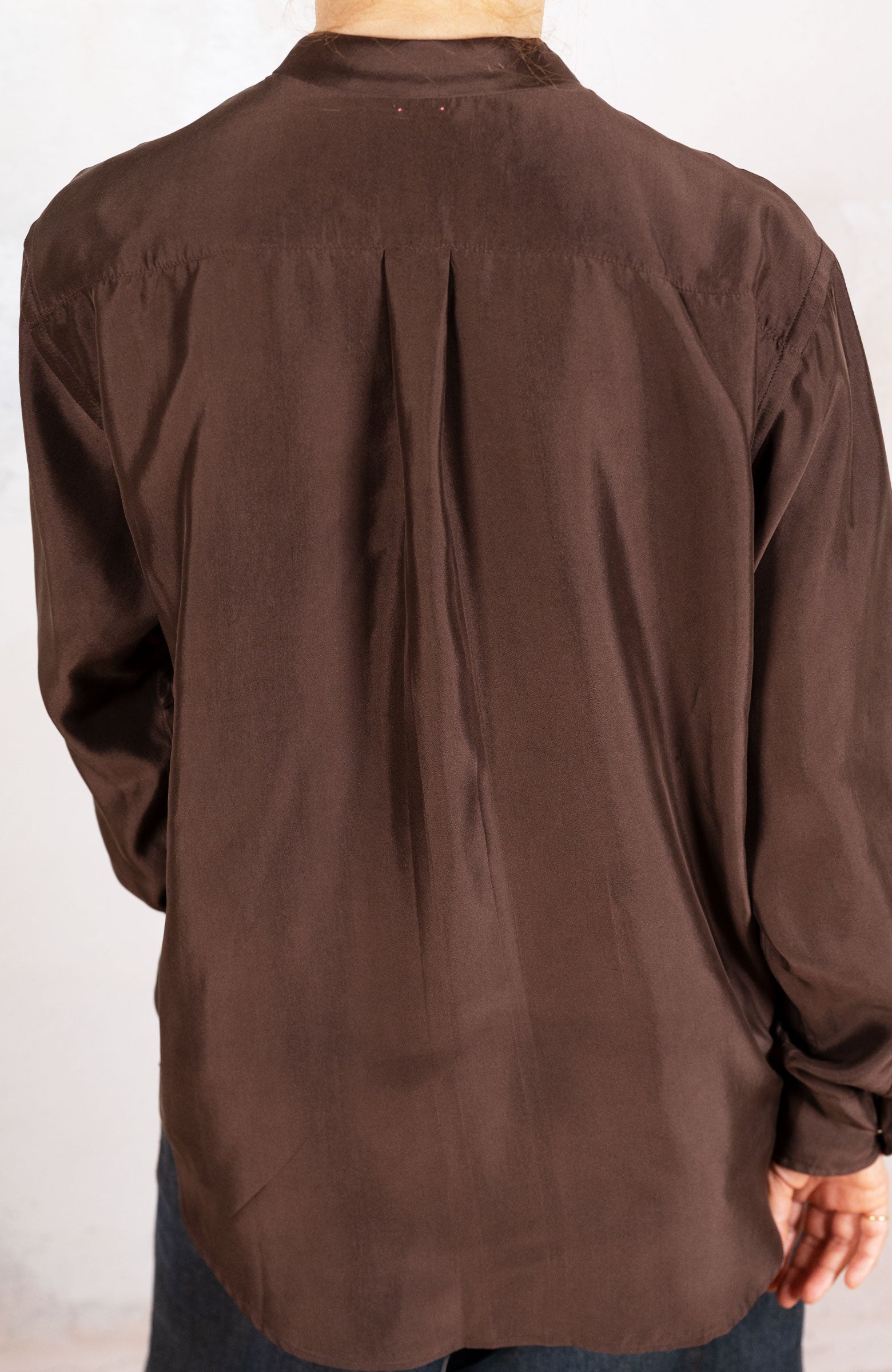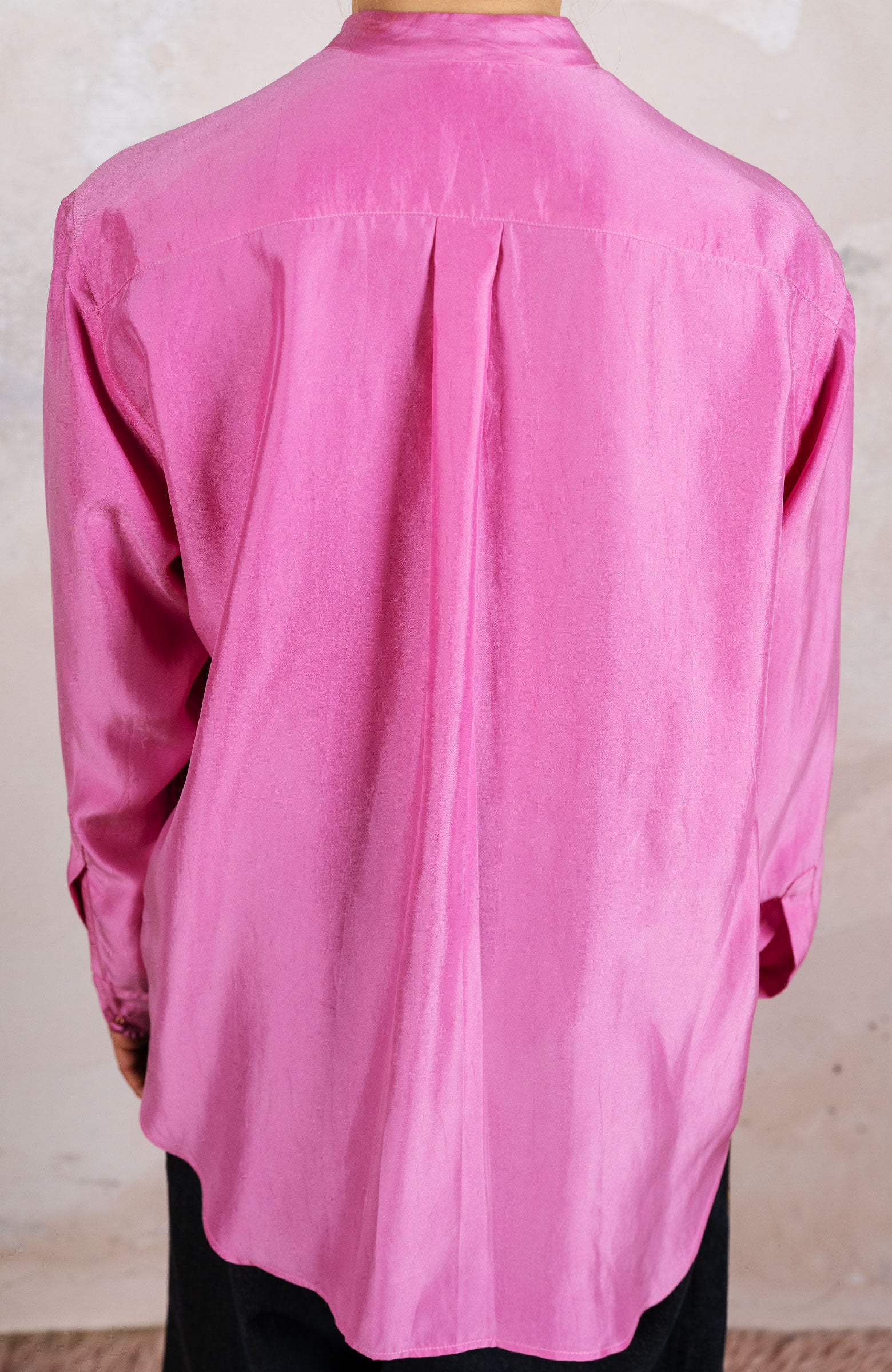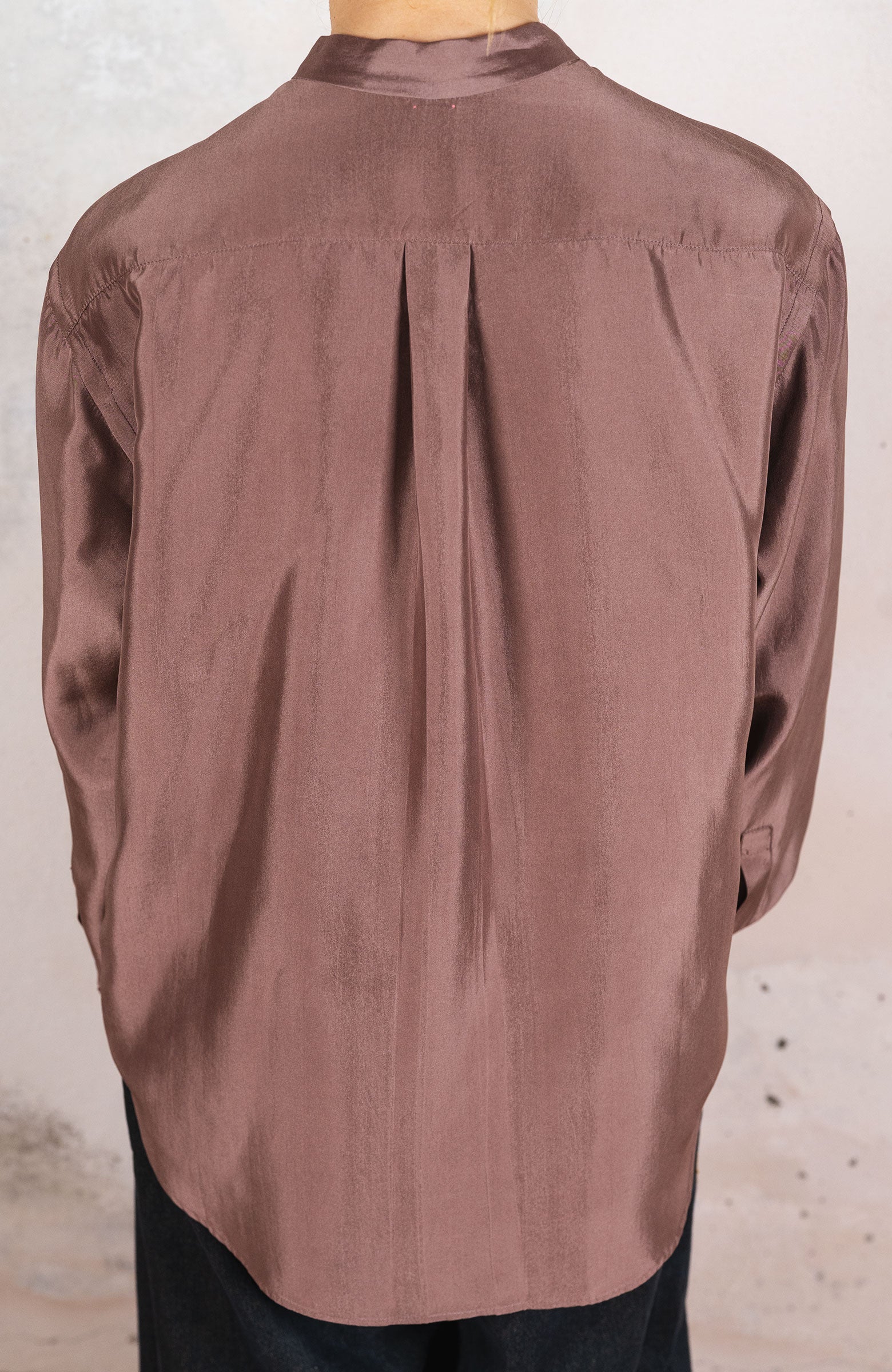 Camicia in raso di seta ispirata alla camicia da uomo di cui conserva alcuni dettagli, come il faldo