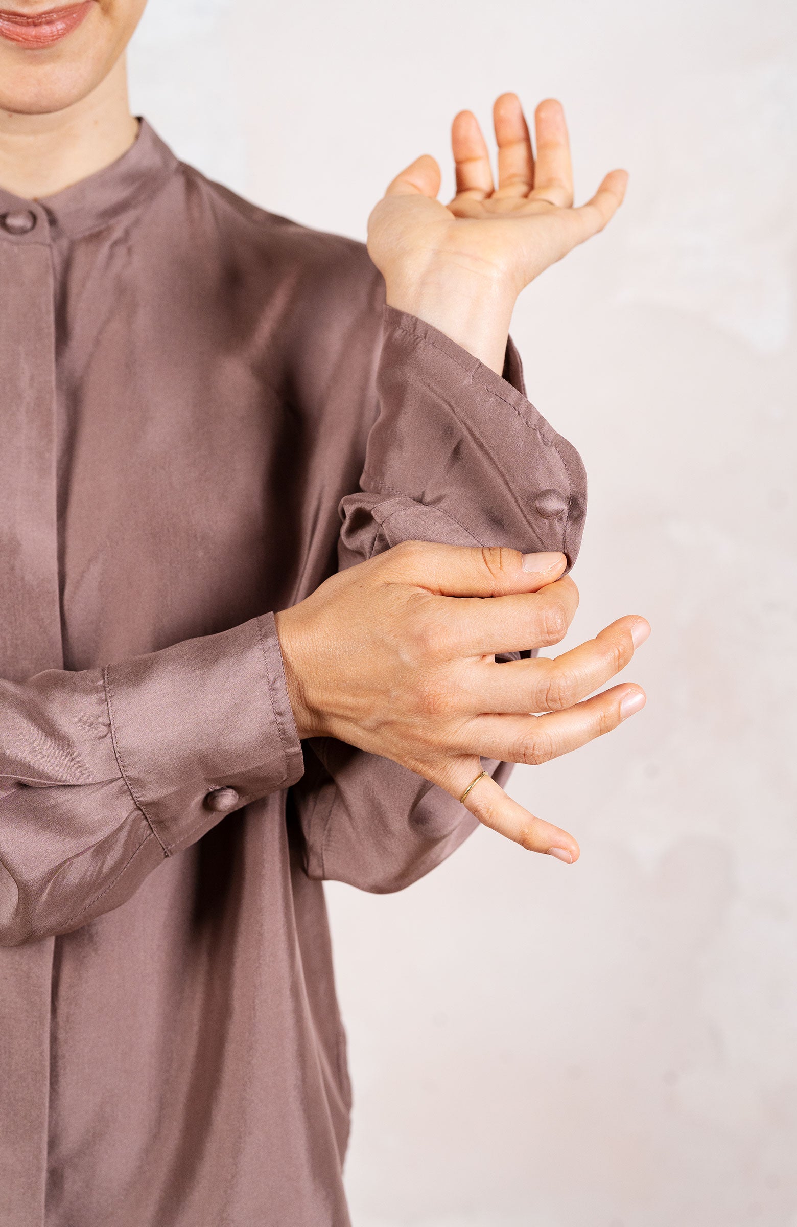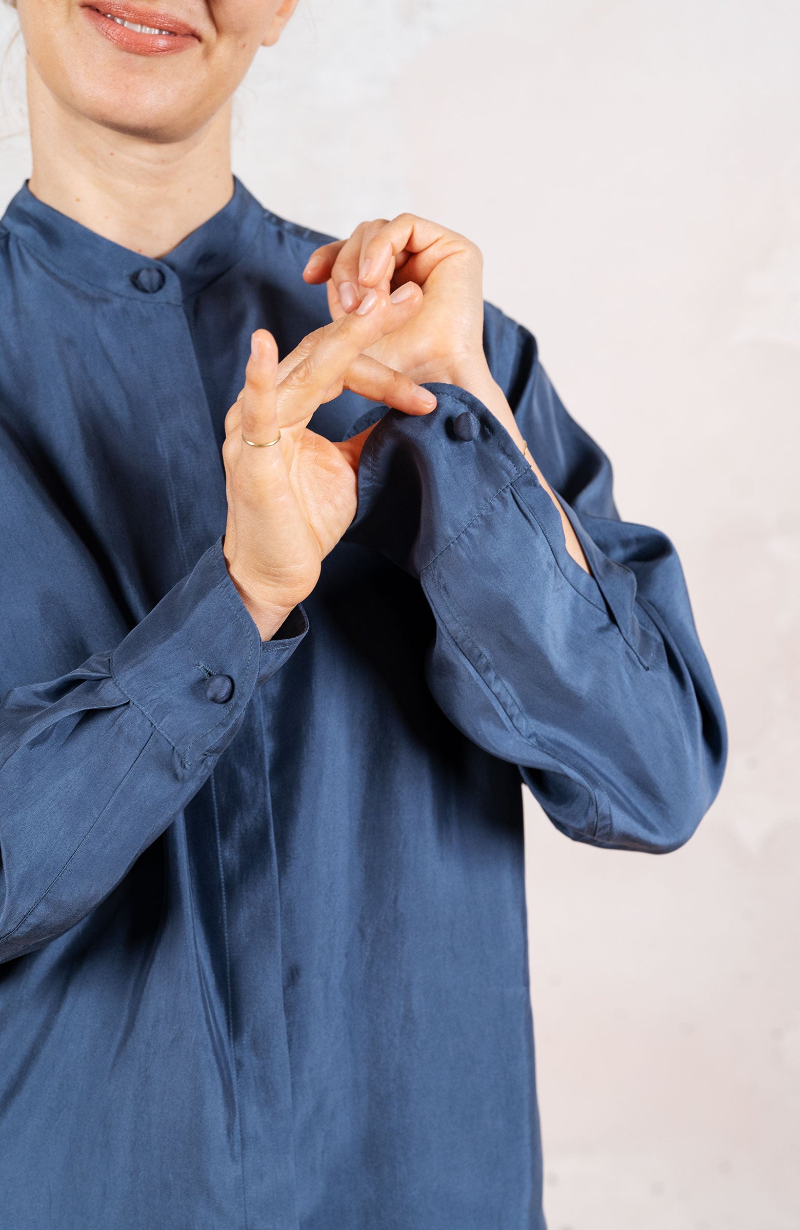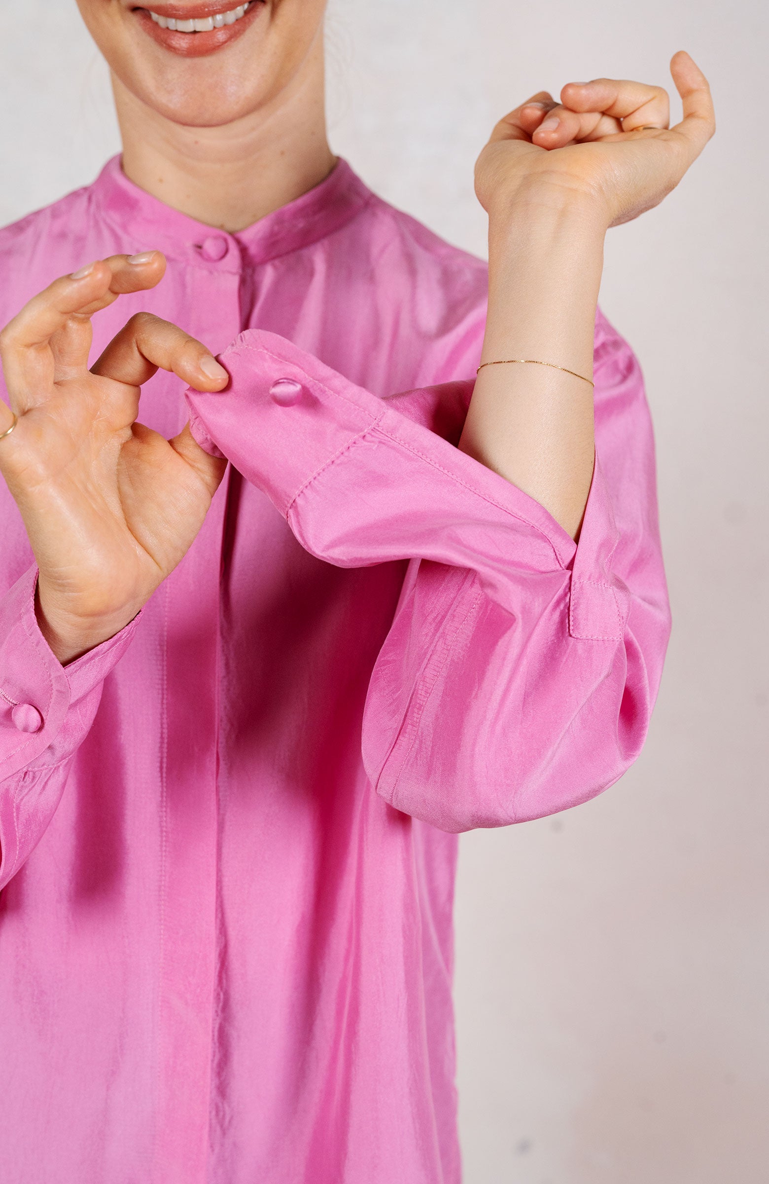 Camicia in raso di seta ispirata alla camicia da uomo di cui conserva alcuni dettagli, come il faldo