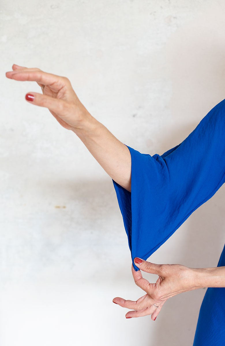 Vestito con scollo profondo e maniche a kimono. Tessuto tagliato in sbiego, profili rifiniti con punti a mano e inserto triangolare sul fondo davanti ispirato agli abiti sartoriali degli anni Venti. Colore chocomelanzana. E’ l'abito perfetto, scivola fluido e liquido sul corpo e lo asseconda nei movimenti e nelle forme, perché tagliato in sbieco e rifinito con infiniti punti a mano. La scollatura profonda e sapiente è ultra femminile. Pesa pochi grammi, non si stropiccia. Lo lavi, lo asciughi al sole e lo metti dopo mezz’ora. Ti verrà consegnato dentro un sacchettino di organza di seta del suo stesso colore.