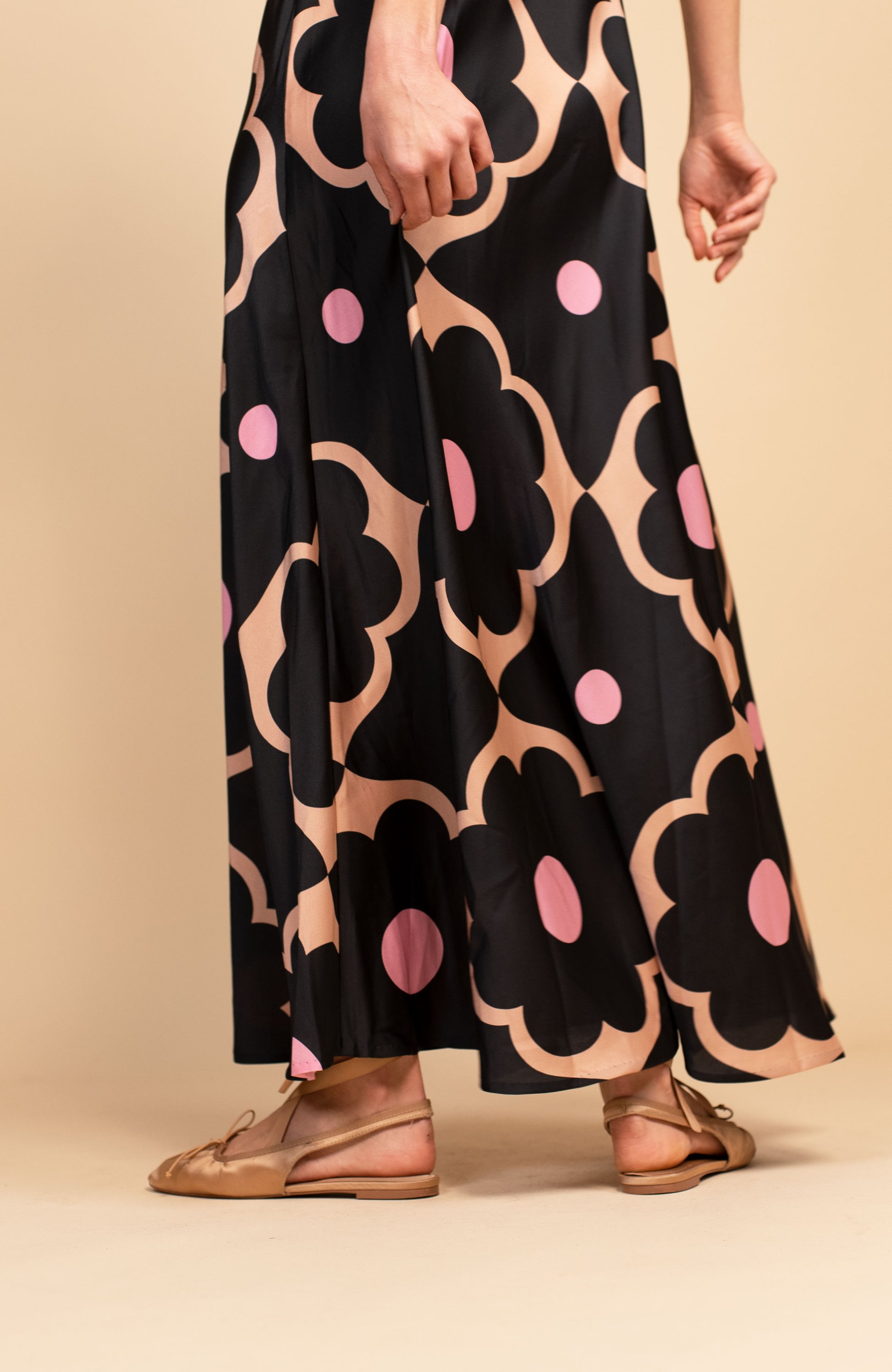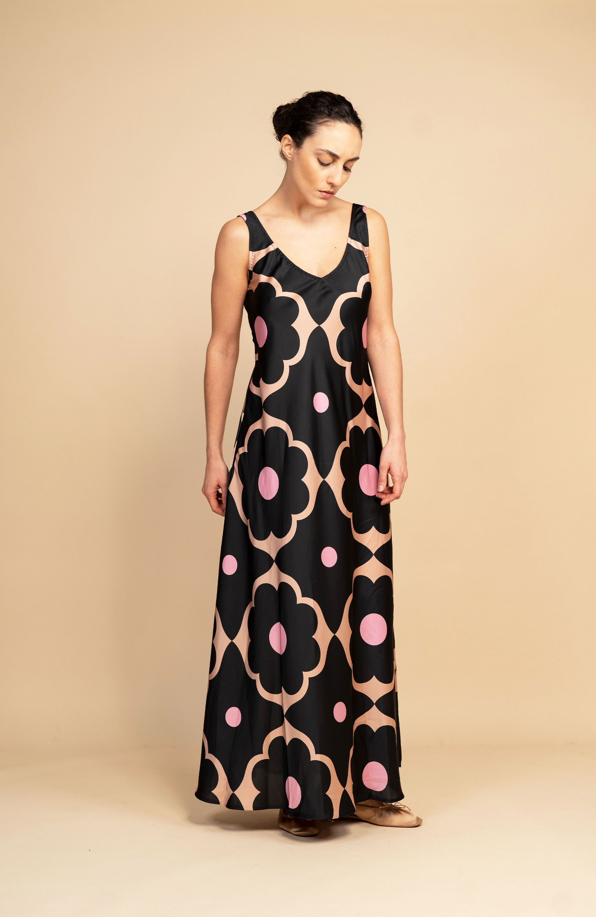 Vestito senza maniche con scollo profondo. Tessuto tagliato in sbieco, profili rifiniti con punti a