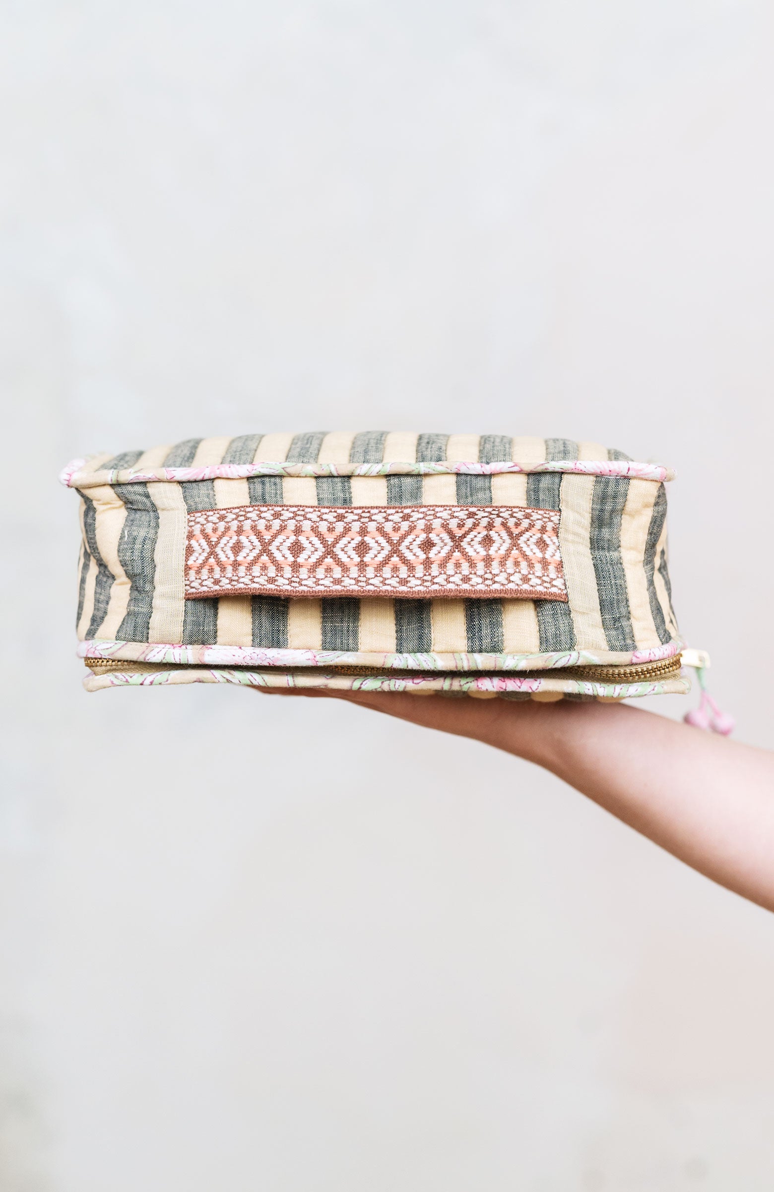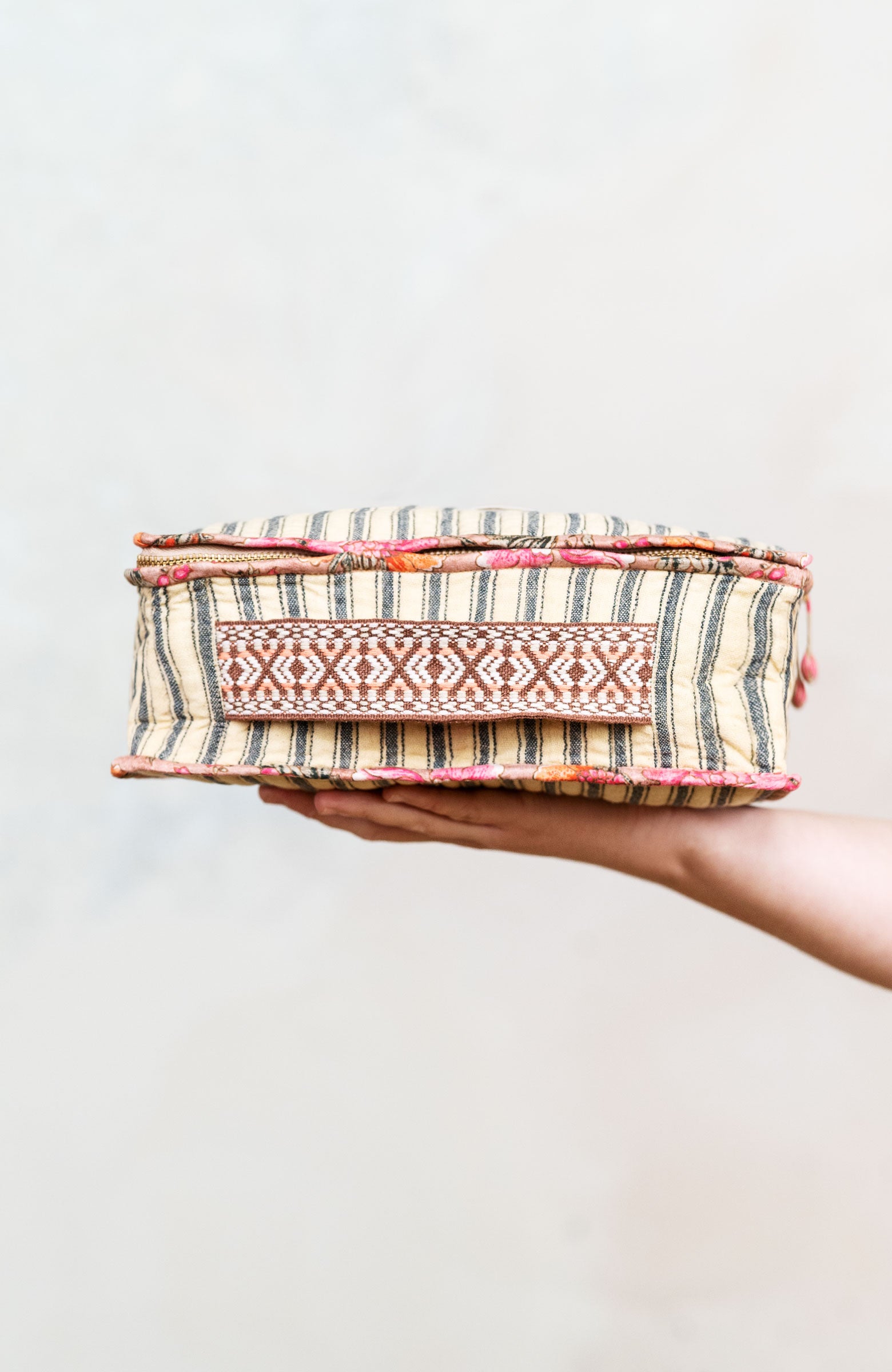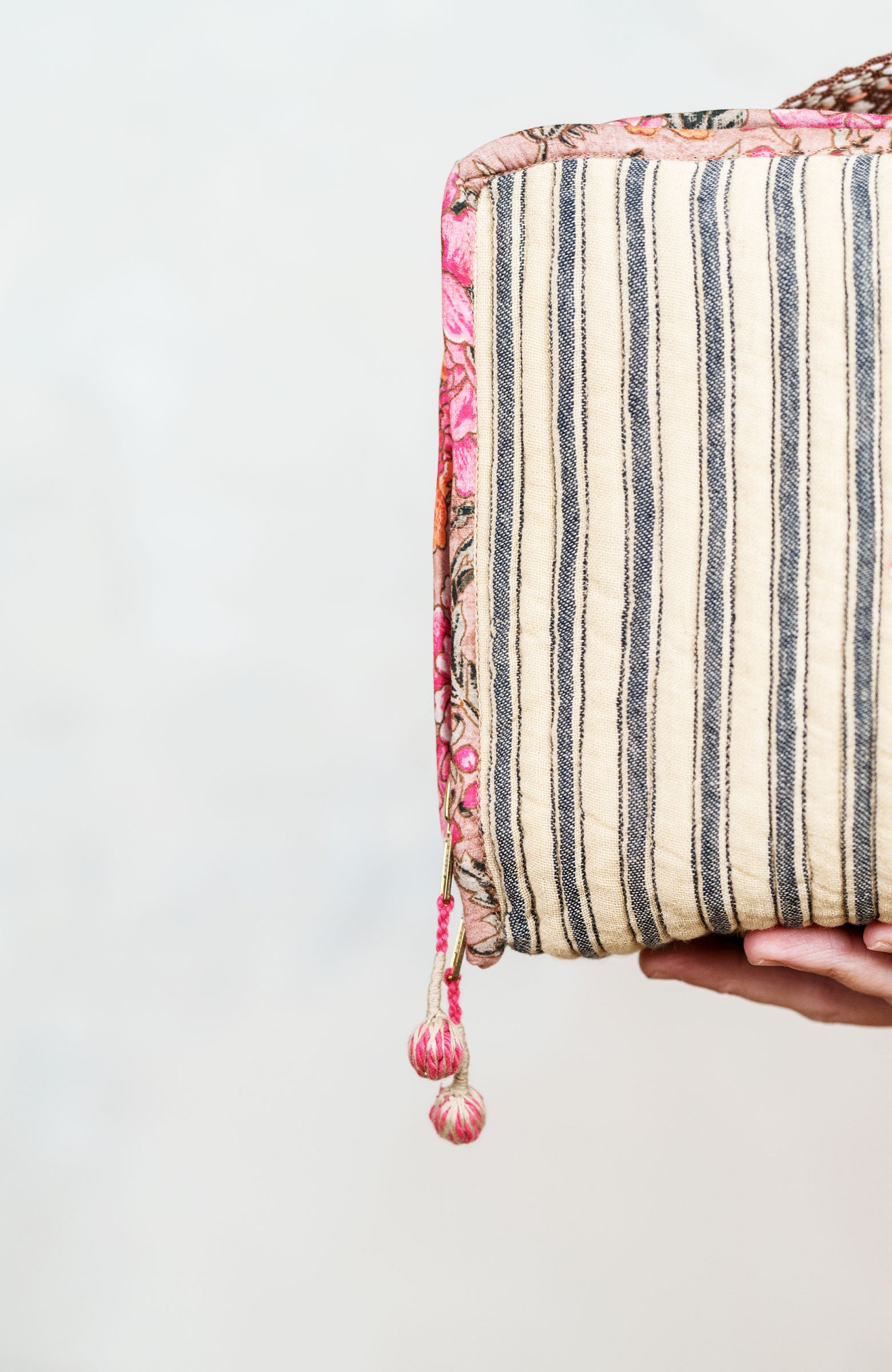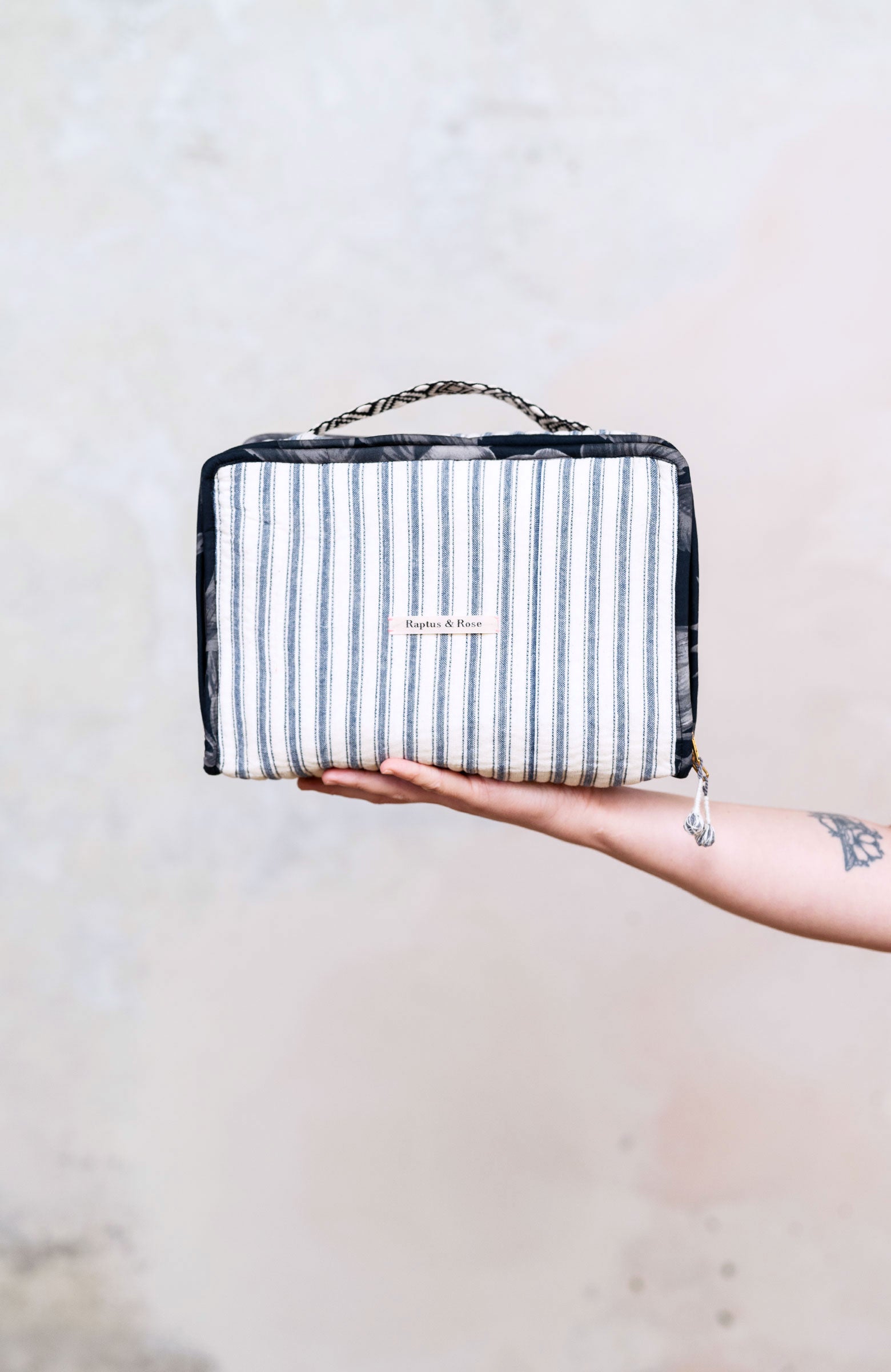 Una valigetta? Un beauty?Entrambi.Il Raptus Case è uno scrigno di cotone.Due tessuti: righe fuori e …