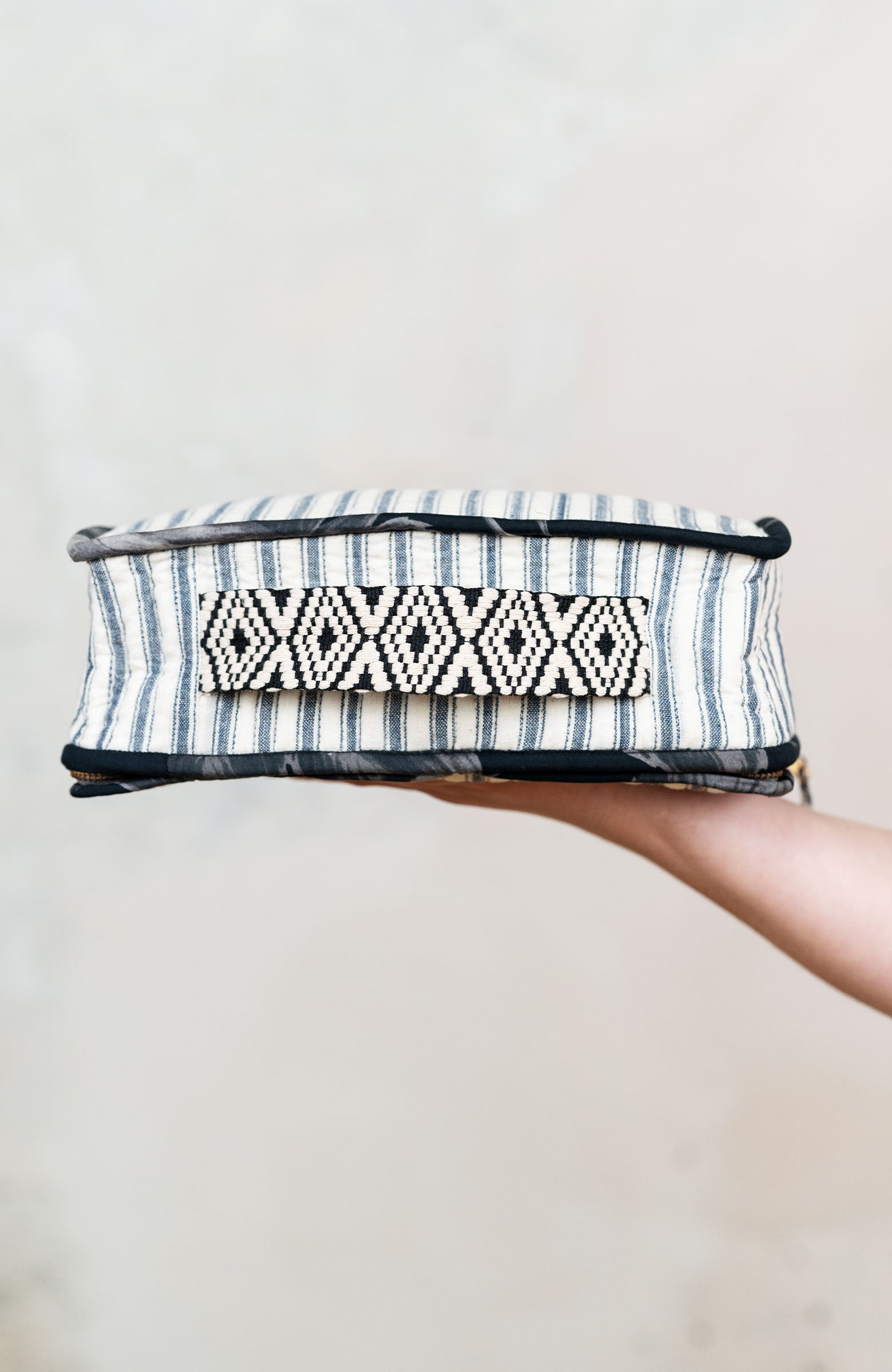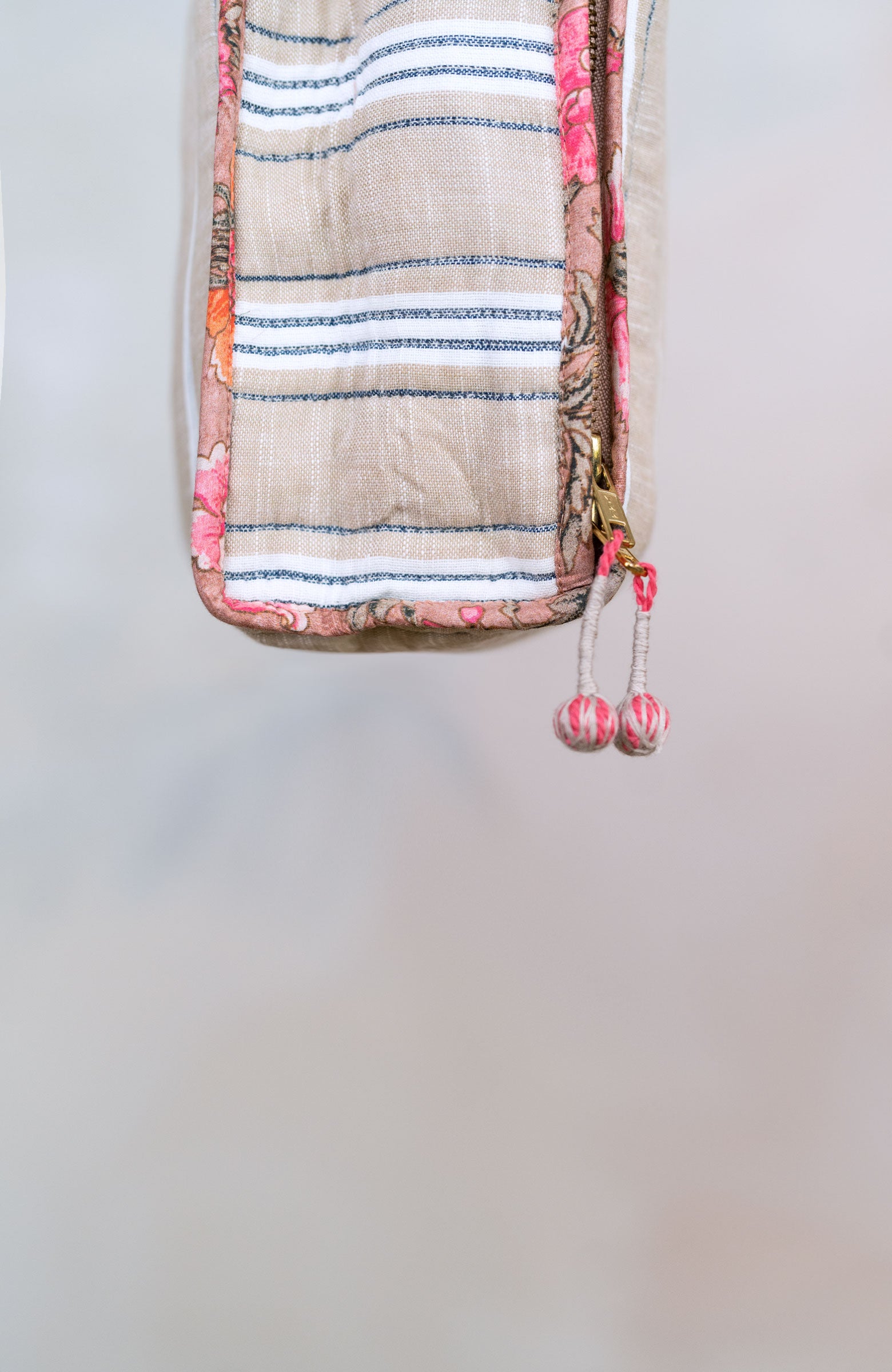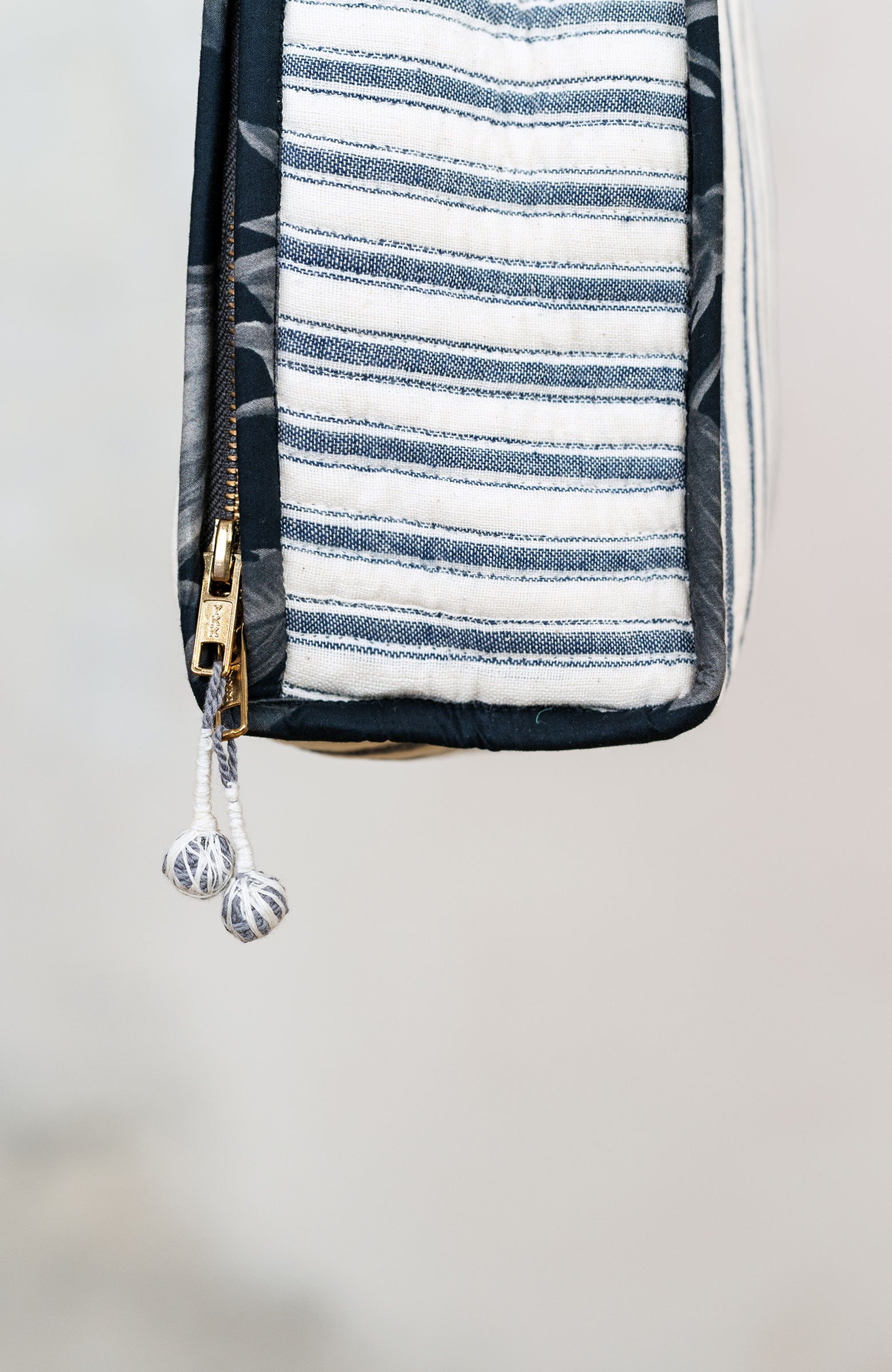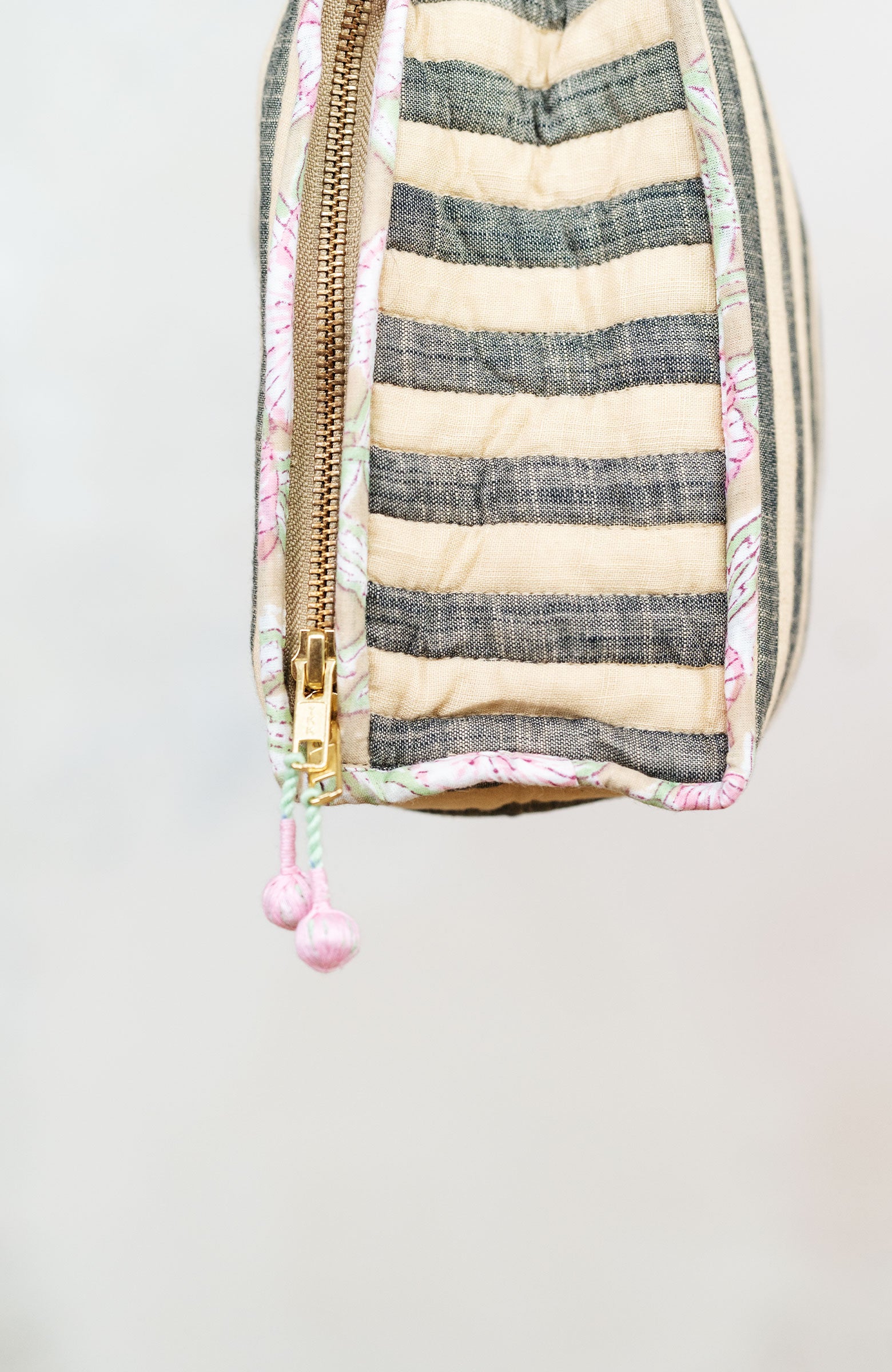 Una valigetta? Un beauty?Entrambi.Il Raptus Case è uno scrigno di cotone.Due tessuti: righe fuori e …