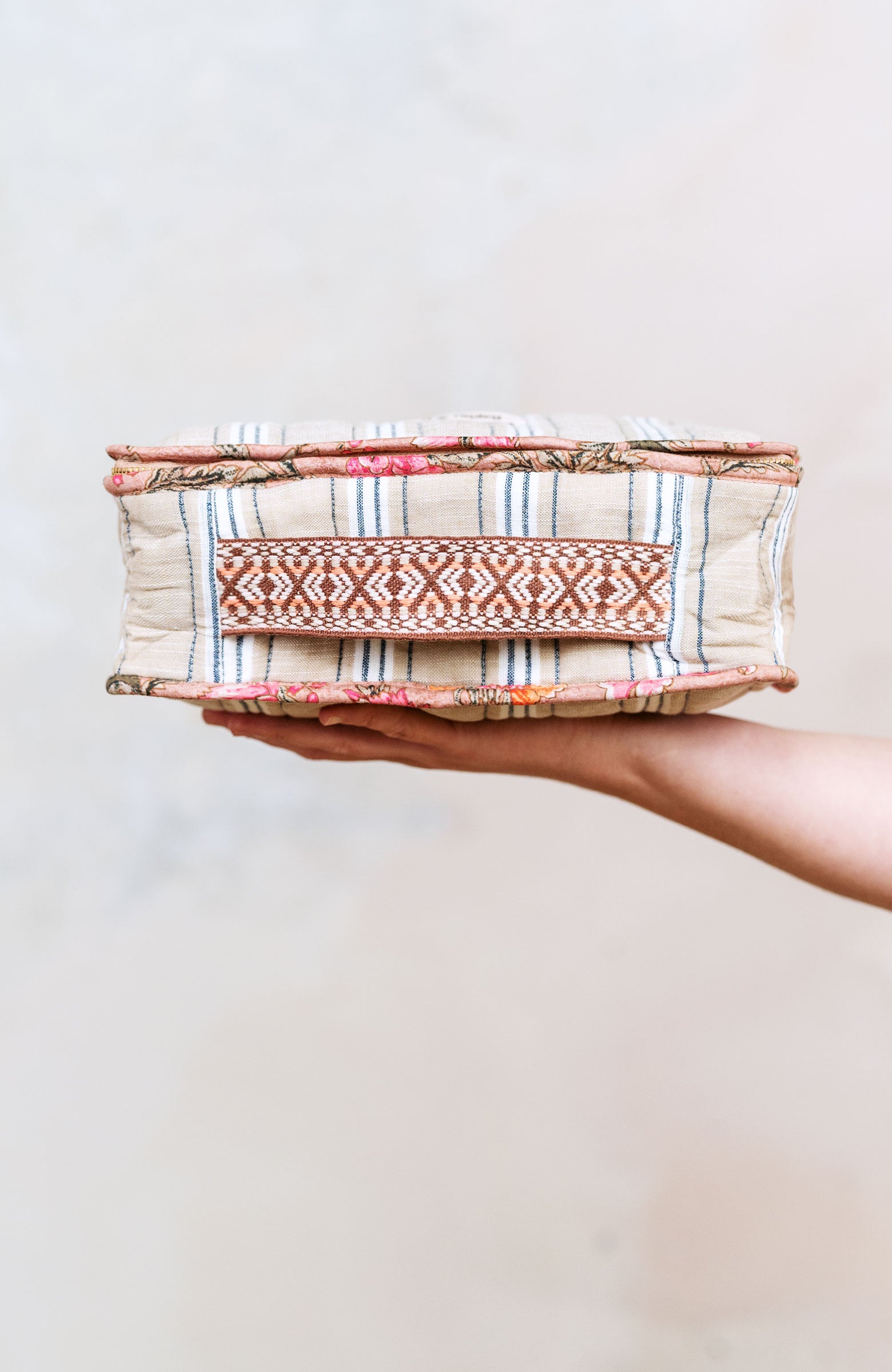 Una valigetta? Un beauty?Entrambi.Il Raptus Case è uno scrigno di cotone.Due tessuti: righe fuori e fiori dentro.Perfetto per la Valigia Perfecta (puoi metterci il tuo maglione preferito, i prodotti per la tua beauty routine, gli oggetti nostalgici, i libri che non smetterai mai di leggere…)