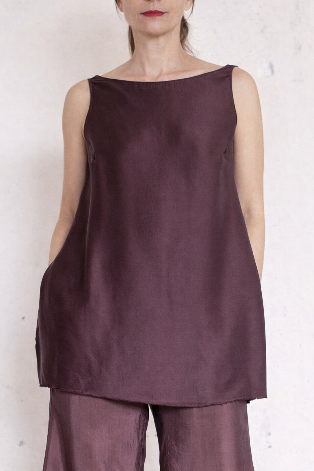 Top di pura seta tinta a mano nei colori Raptus, frutto di ricerca appassionata. Spacchi sui fianchi